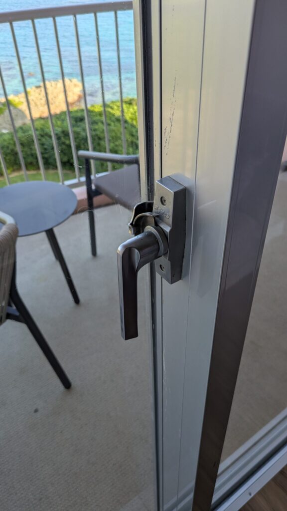 また、予約の際にいろんなサイトやYouTubeでお部屋の様子を見ていると、窓の鍵の位置が低く、ロック機能もないように見えました。