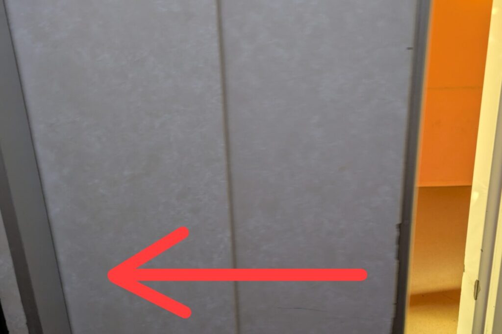 よくあるのが両開き。こちらのエレベーターは、片開きで、2枚が重なってスライドするタイプ。しかもエレベーターがそこそこ狭いので、子どもたちの手がドアに当たりそうになりヒヤッ。